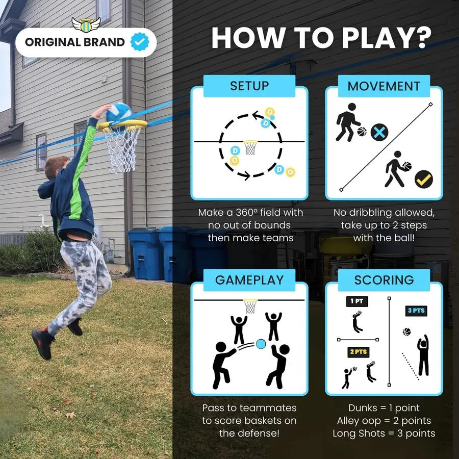 - All-in-one package: Comes with a custom leather ball, durable rim with net, slackline and ratchet, straps, protectors, and a carrying bag for travel and storage.
