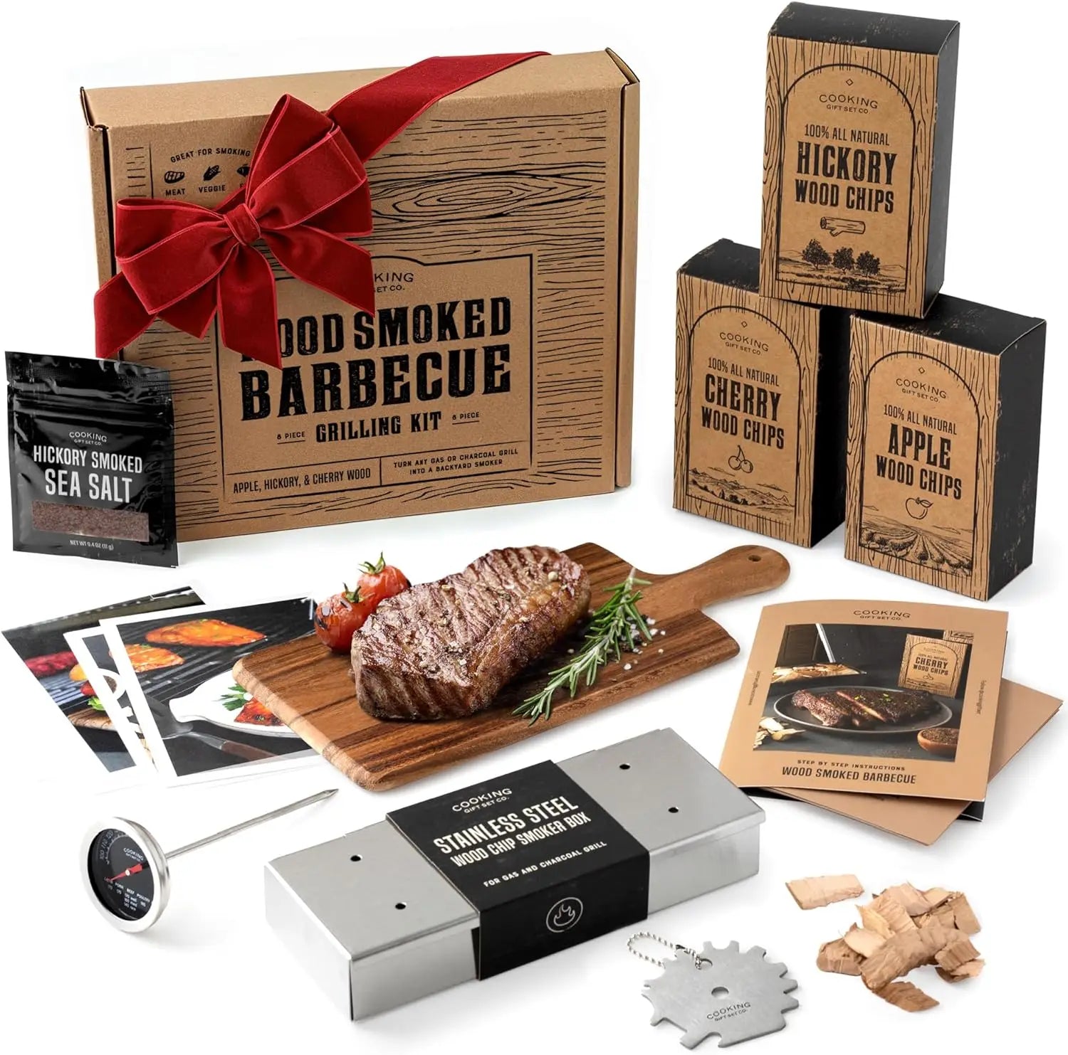 - Comprehensive 8‑piece set: A heavy‑duty stainless steel smoker box with a hinged lid for easy chip refills, a meat thermometer for precise temperature control, a grill scraper for maintenance, smoked hickory salt for seasoning, three wood chip varieties (Apple, Cherry, Hickory) for a spectrum of smoke flavors, and recipe cards with step‑by‑step instructions.