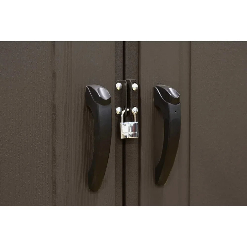 - Arched, steel-reinforced doors with a 4' wide x 6' high opening and an internal latching mechanism; lockable for secure storage.
