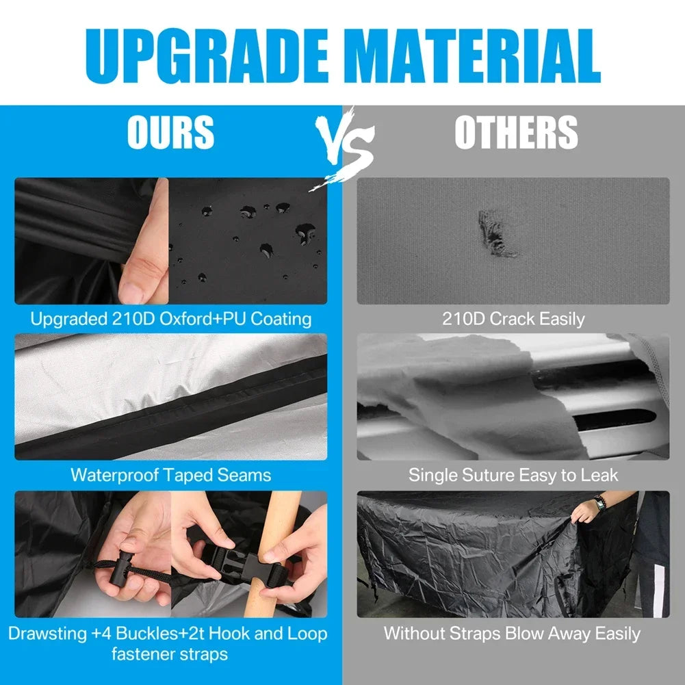 - Windproof and secure: 2 reinforced handles, covered mesh ventilation, elastic hem cord, and 4 corner click-close straps keep the cover in place during gusts.