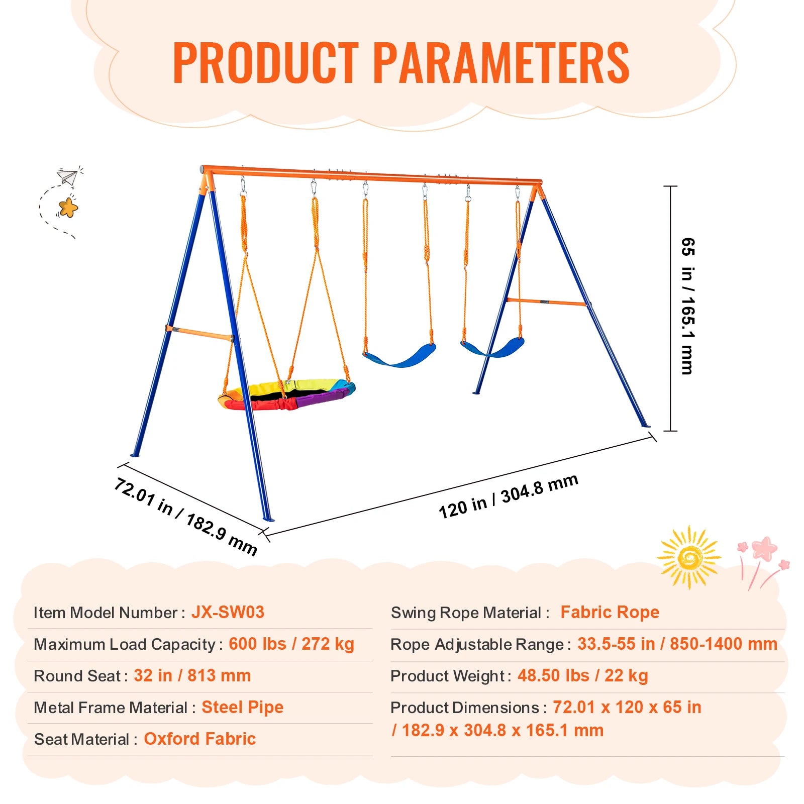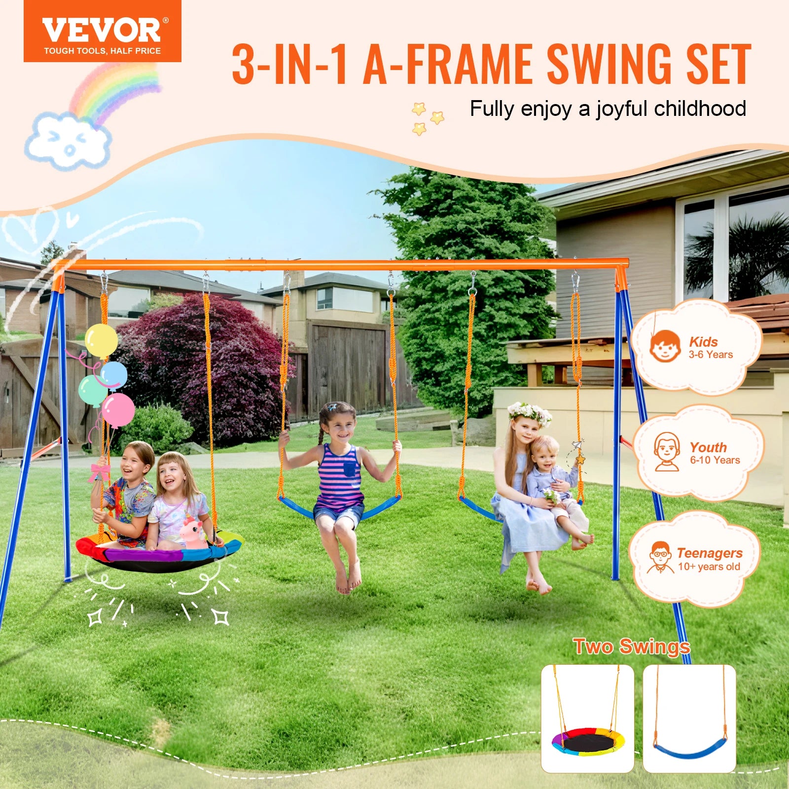 - Universal compatibility: The A-frame design allows swapping the round seat for other swing styles, expanding play options without needing a new set.