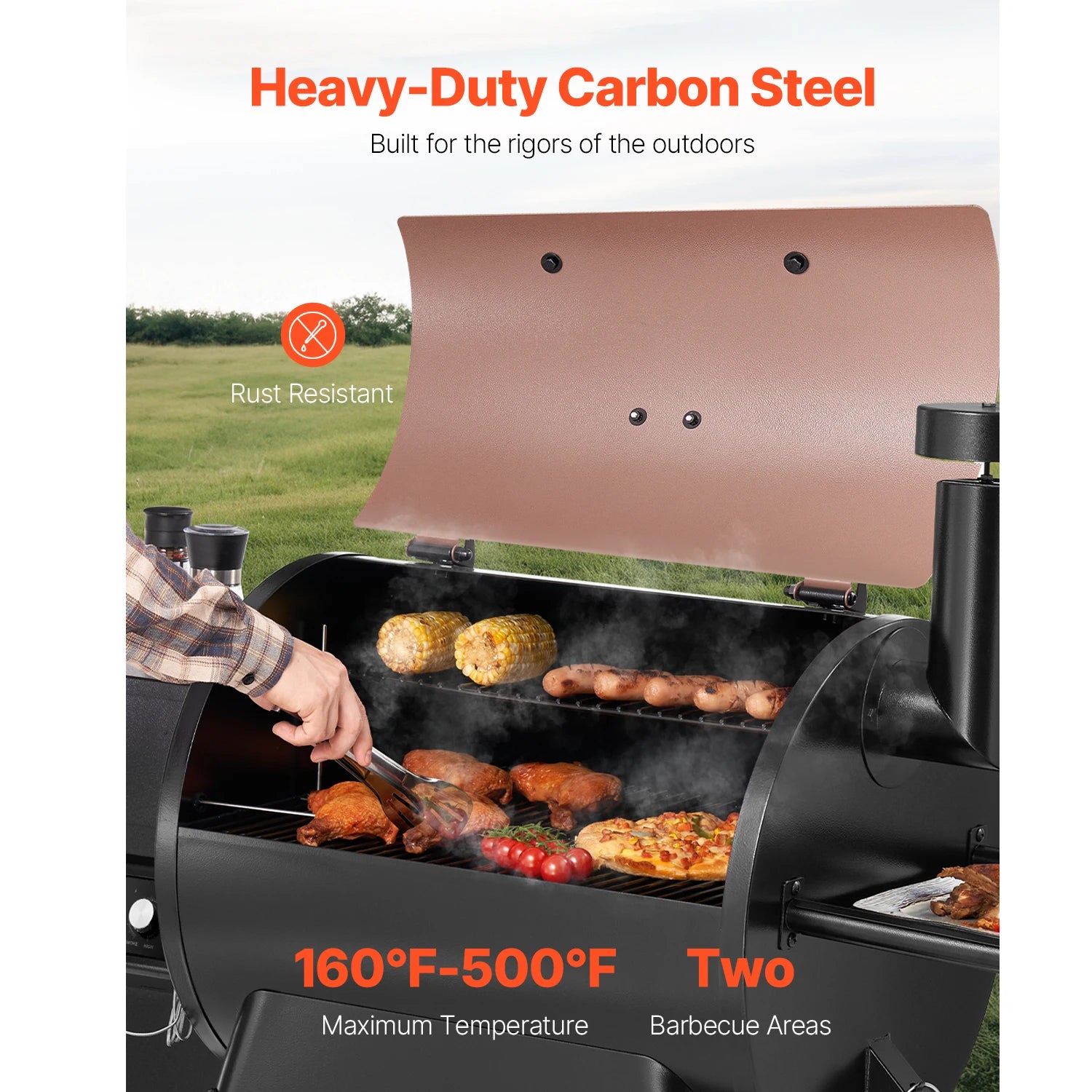 - Heavy-duty carbon steel construction with a high-temperature powder coating resists rust and stands up to outdoor use from 160°F to 500°F.