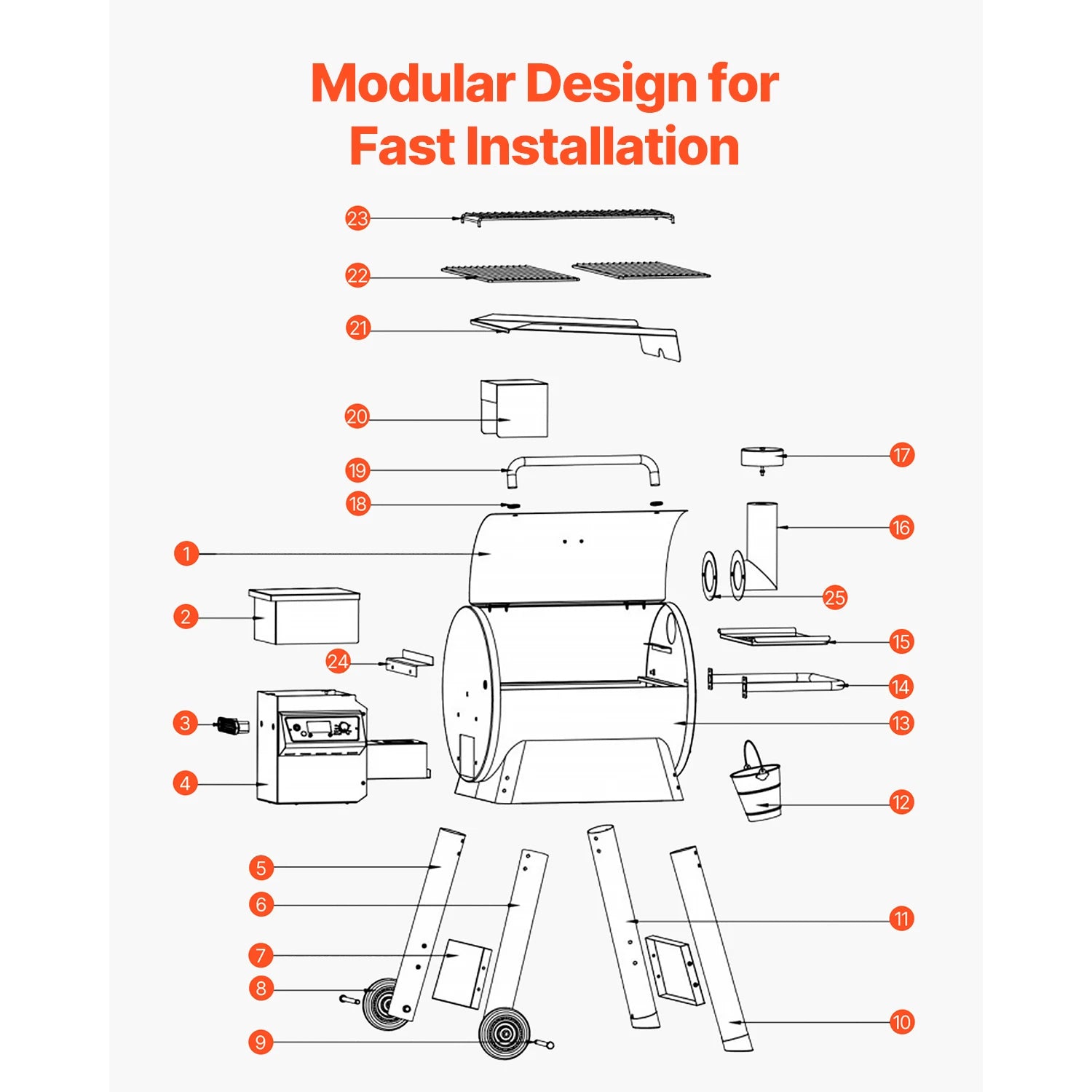 Assembly is straightforward with included tools, and the rust-resistant carbon steel body cleans quickly with a damp cloth. The included meat probe accessory simplifies multi-piece cooks, while the modular design supports easy cleaning and long-term durability.