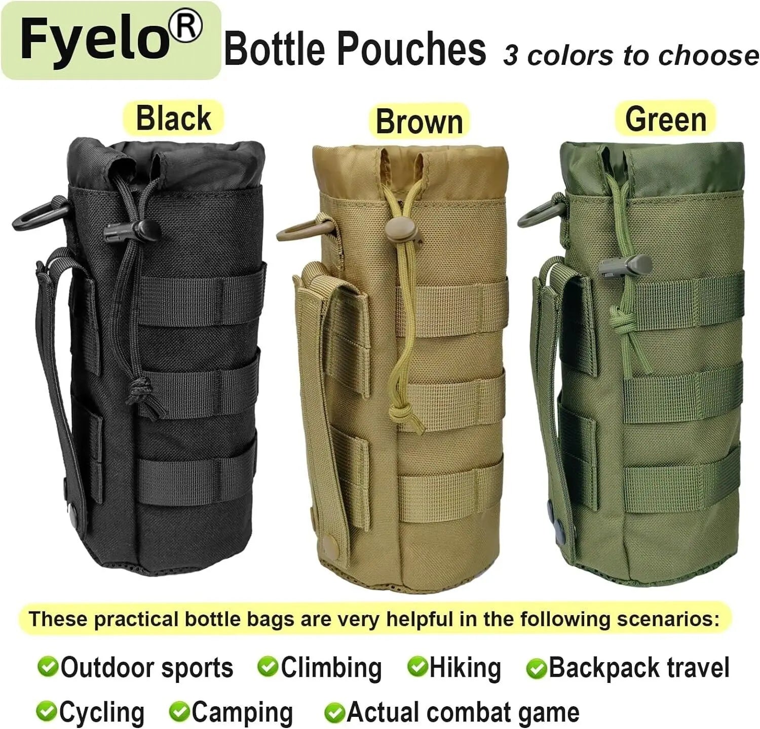Fyelo MOLLE Water Bottle Pouch is built for rugged outdoor tasks and adventures, keeping your bottle secure, accessible, and ready on the move.